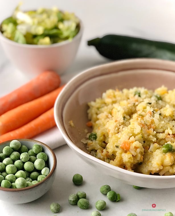 - Gemüse: 3 mittelgroße Karotten, 1 Zucchini, 50 g TK-Erbsen