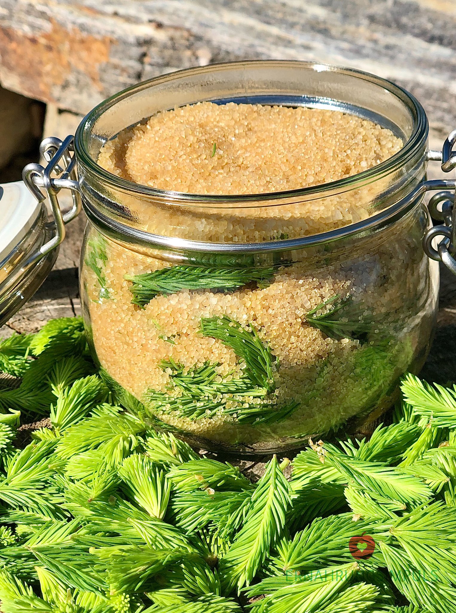 - Fülle nun die Wipferl ein (ich schneide sie vorher sehr grob durch) - wichtig: die Wipferlschicht sollte doppelt so dick sein, wie die Zuckerschicht!