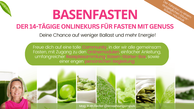 Beim Basenfasten wird eine Zeit lang ganz bewusst auf alle säurebildendenden Lebensmitteln auf unserem Speiseplan verzichtet. Es werden nur basenbildende Lebensmittel verzehrt. Durch die 14-tägige Basenfastenkur leistest du einen wertvollen Beitrag zur aktiven Entsäuerung deines Körpers und zur Regulation deines Säure-Basen-Haushalts. Dein Organismus, deine Verdauung wird entlastet, deine Fettverbrennung wird aktiviert und dein Energielevel steigt wieder.
